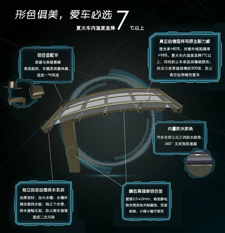 天博网页版-天博(中国)车棚系列全部采用高品质、高强度铝合金材料精加工而成,具备的氧化保护能力,不生锈,表面特殊的工艺处理,大大提高了车棚的使用寿命。顶棚使用添加了防止紫外线涂层的德国拜耳耐力板,降低了来自紫外线的分解,历久弥新,成就了优越的耐候性。